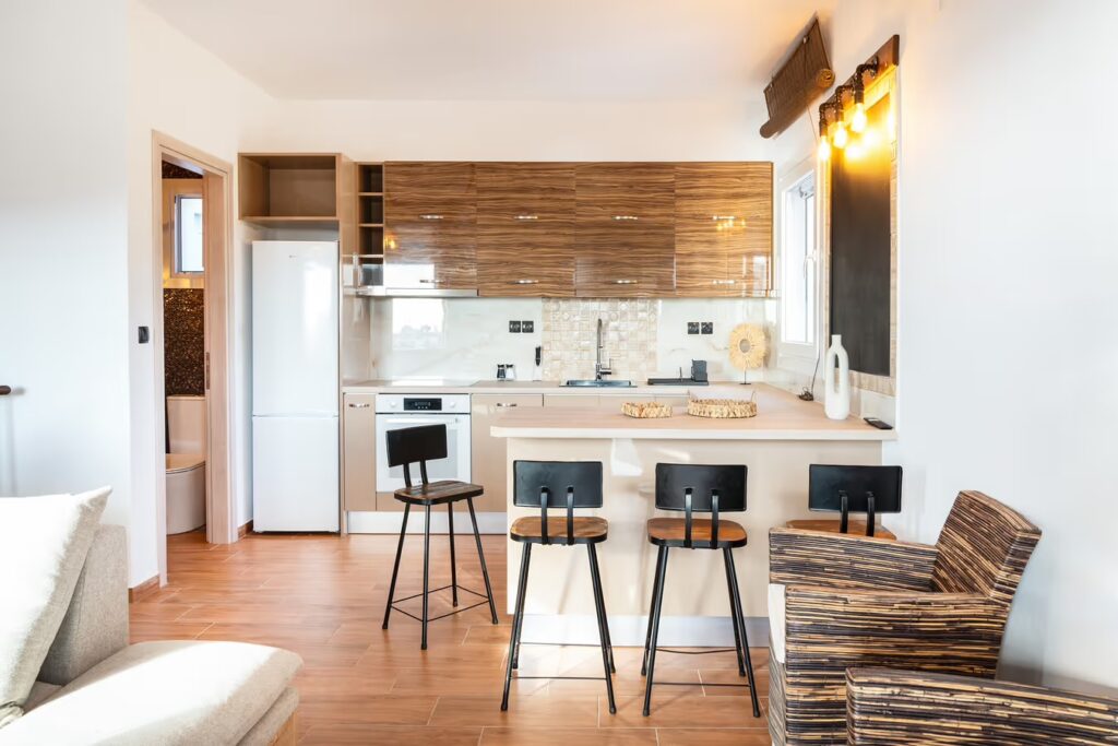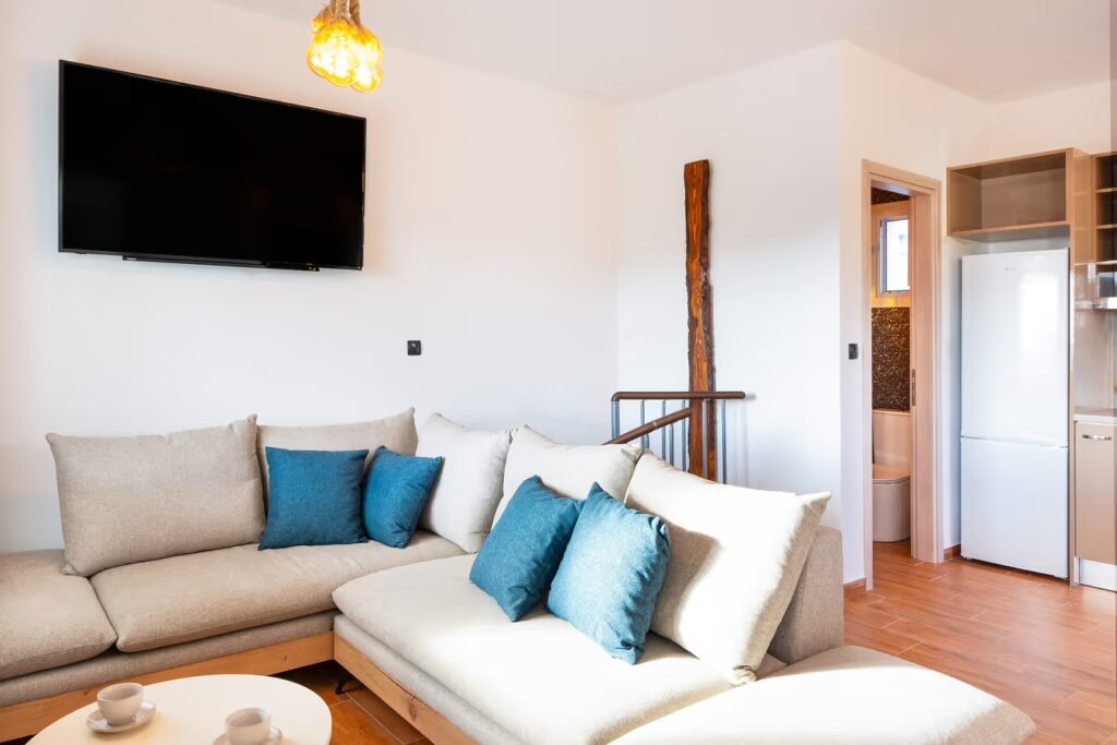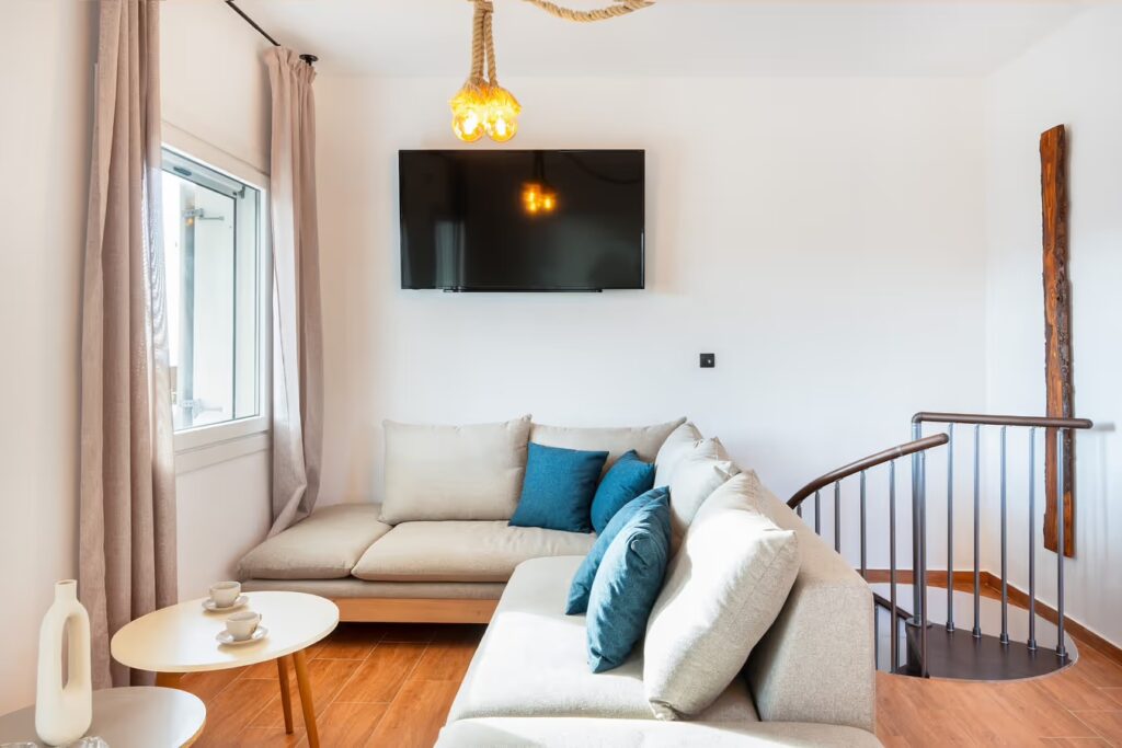 - Fully Equipped: The upper floor features a modern kitchen with all necessary appliances, air conditioning, high-speed Wi-Fi, and a Smart TV.